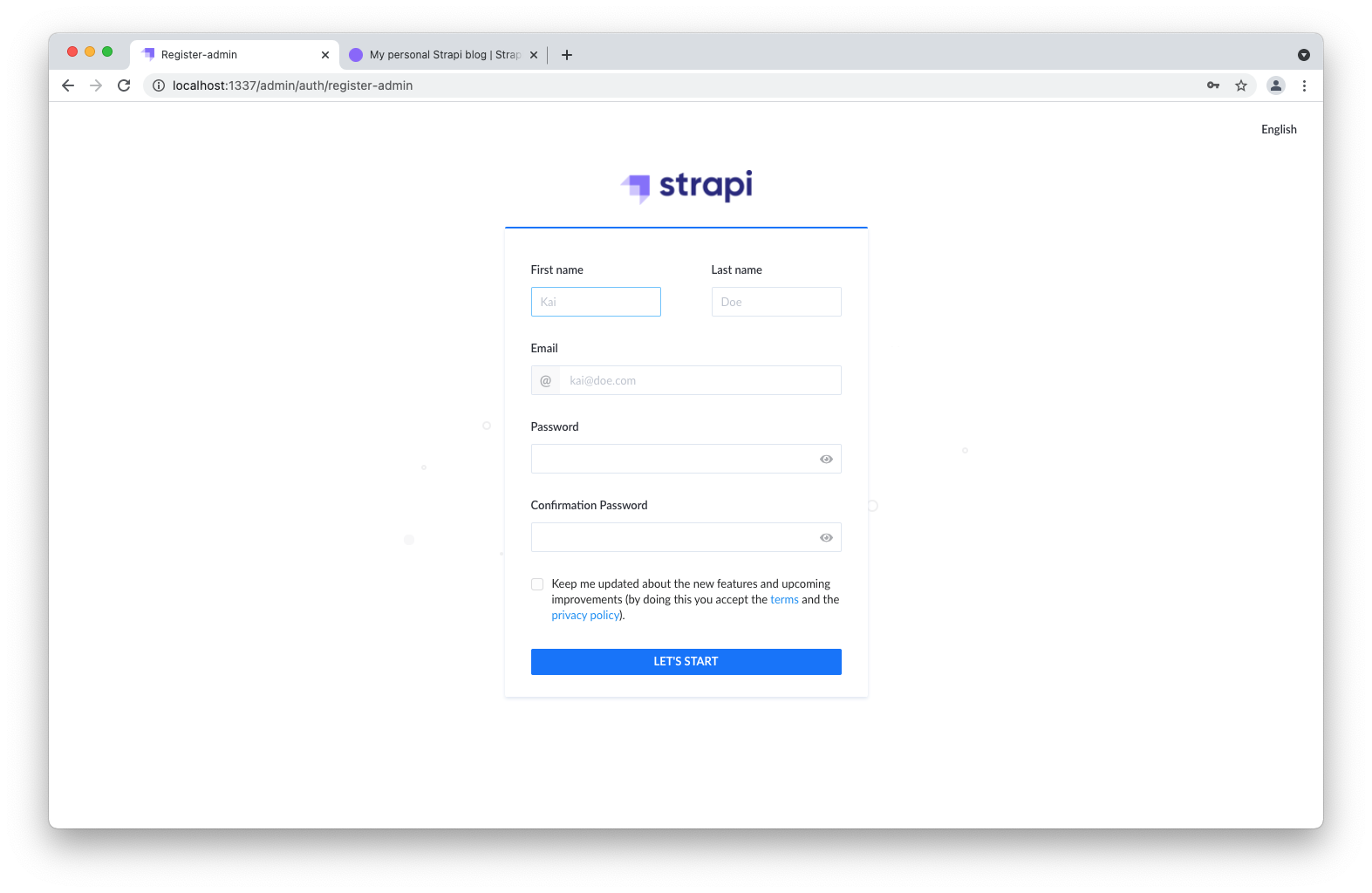 By completing the form in the first tab, you create your own account. Once done, you become the first administator user of this Strapi application. Welcome aboard, commander!